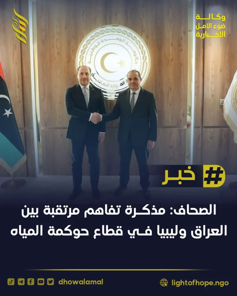 أعلن القائم بأعمال سفارة العراق أحمد الصحاف قرب توقيع مذكرة تفاهم بين العراق وليبيا لتعزيز التعاون وتبادل الخبرات في مجال حوكمة وإدارة المياه.