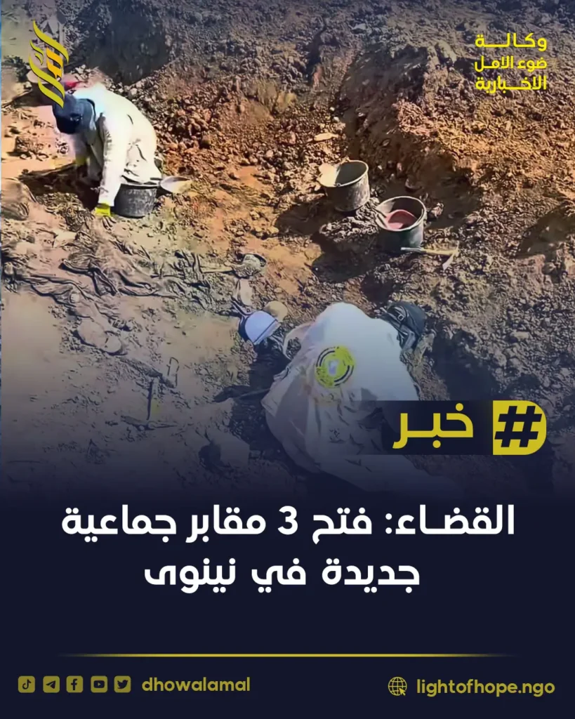 أعلن مجلس القضاء الأعلى فتح ثلاث مقابر جماعية جديدة في نينوى تعود لضحايا جرائم داعش خلال سيطرته على الموصل.