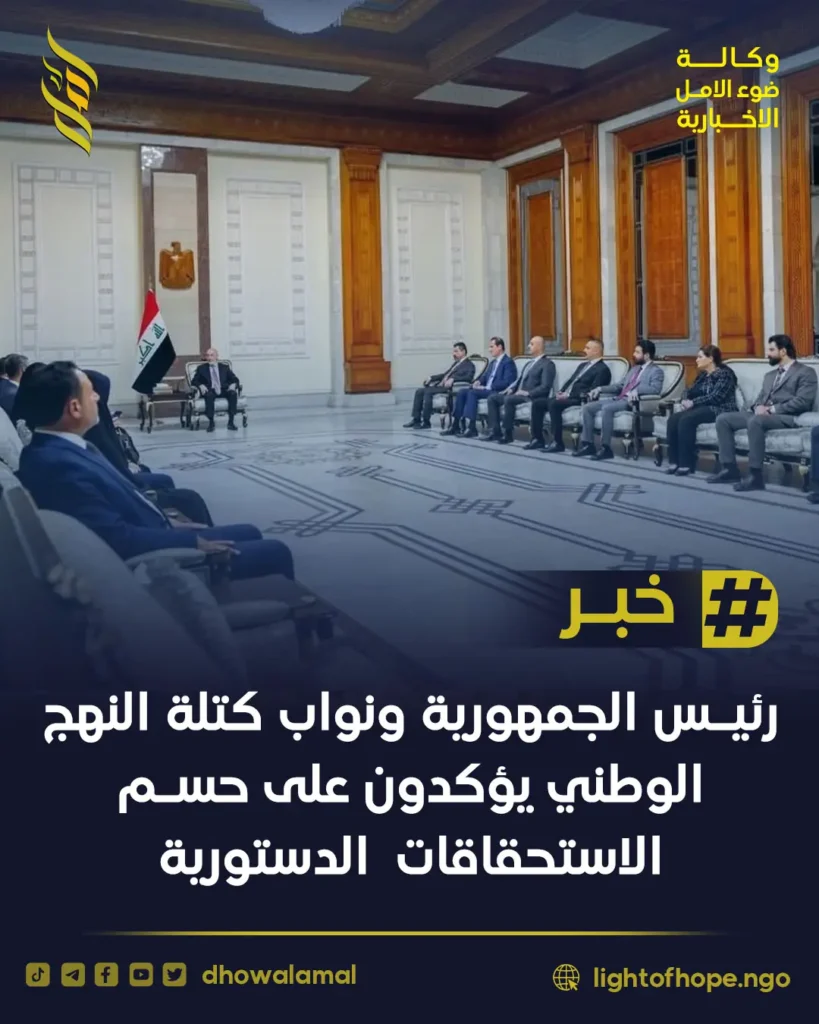 أكد رئيس الجمهورية نزار آميدي مع نواب كتلة النهج الوطني أهمية حسم الاستحقاقات الدستورية والتنسيق بين السلطات لتشكيل حكومة مستقرة.