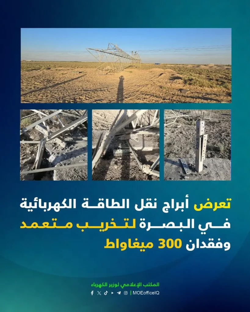 بيان وزارة الكهرباء حول تعرض أبراج نقل الطاقة في محافظة البصرة للتخريب المتعمد