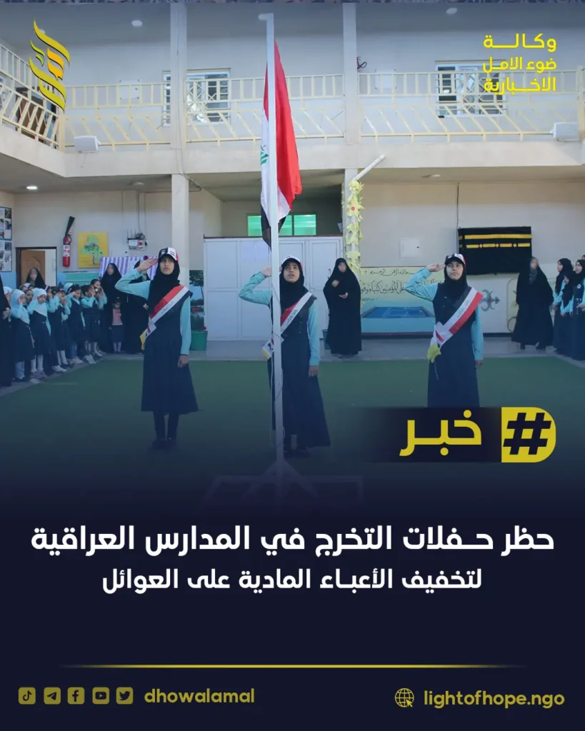 وزارة التربية العراقية تقرر منع حفلات التخرج في المدارس الحكومية والأهلية، مشيرة إلى أن بعض المدارس تنظم حفلات خلافًا للتعليمات عبر جمع تبرعات من أولياء الأمور دون ضوابط رسمية، وبمبالغ كبيرة تُثقل كاهل العائلات