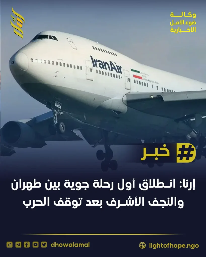 وكالة إرنا: انطلاق أول رحلة إيرانية إلى مطار النجف الأشرف الدولي مع استئناف الرحلات بواقع 3 أسبوعياً بين طهران والنجف.